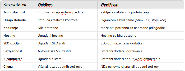 Obje platforme su moćne, ali izbor zavisi od vaših potreba. Webflow je idealan za dizajnere i preduzetnike koji žele brzo i efikasno kreirati profesionalne sajtove bez tehničkih komplikacija. WordPress, s druge strane, pruža više fleksibilnosti i ekosistem dodataka, ali zahtjeva više održavanja.